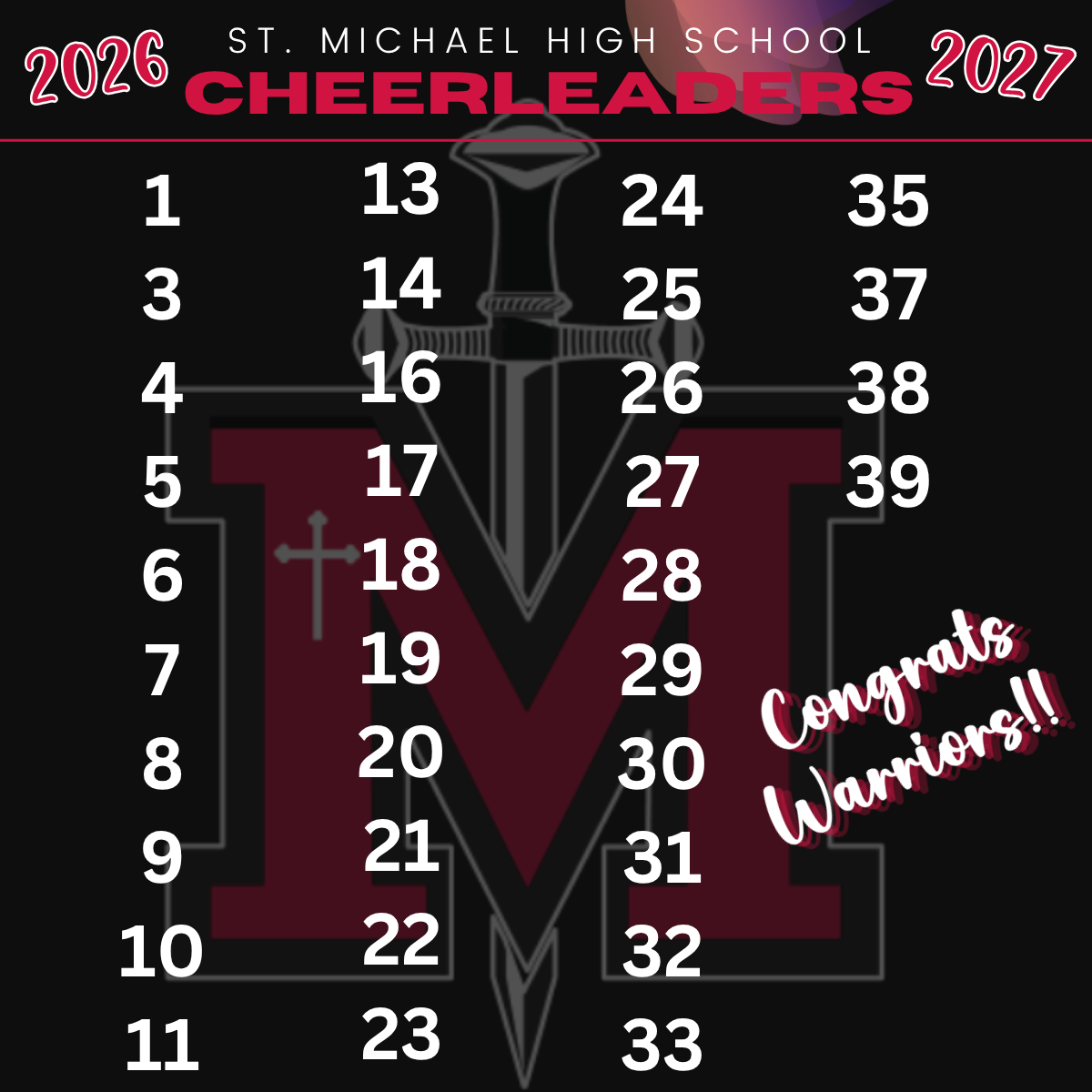 We are the support system behind St. Michael High School, and there is nothing we love more than cheering our Warriors on to victory! We also compete in Regional, State, and National competitions in the Small Varsity and Game Day Divisions. Look for us on the sidelines at your next athletic event. Go Warriors!